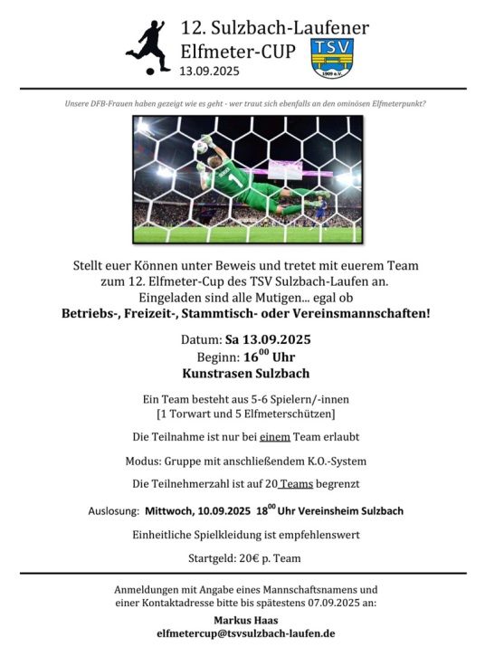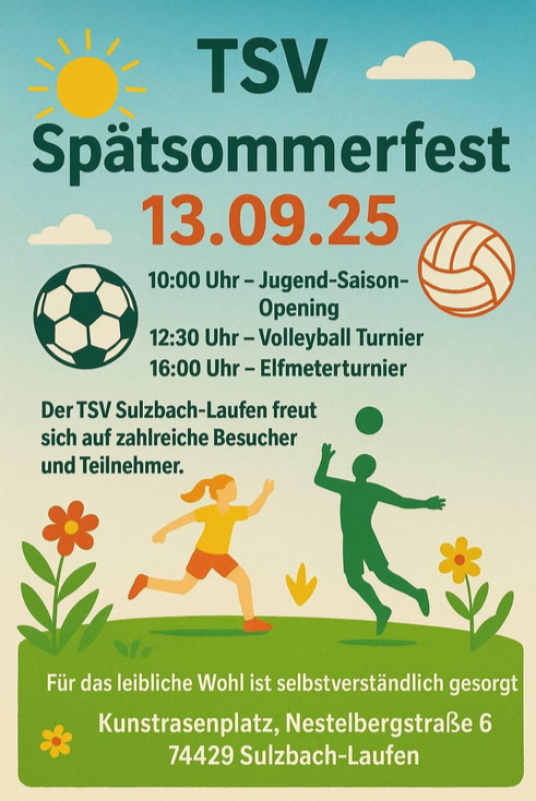 Einladung zur Hauptversammlung am 09.Mai 2025 Alle Mitglieder des TSV Sulzbach-Laufen e.V. sind ganz herzlich zu unserer Hauptversammlung am 09.05.2025 im Vereinsheim eingeladen. Beginn ist um 19:30 Uhr. Tagesordnungspunkte 1. Bericht des 1. Vorsitzenden 2. Bericht des Schriftführers 3. Bericht des Kassiers 4. Bericht des Jugendleiters 5. Berichte aus den Abteilungen 6. Bericht des Kassenprüfers 7. Entlastung der Vorstandschaft und Kassenprüfer 8. Beschlussfassung über Anträge 9. Neuwahlen 10. Verschiedenes Anträge zur Tagesordnung müssen bis spätestens 25.04.2025 beim 1. Vorsitzenden Steffen Unzeitig, Sommerrain 20, 74429 Sulzbach-Laufen oder per Email an steffen.unzeitig@tsvsulzbach-laufen.de